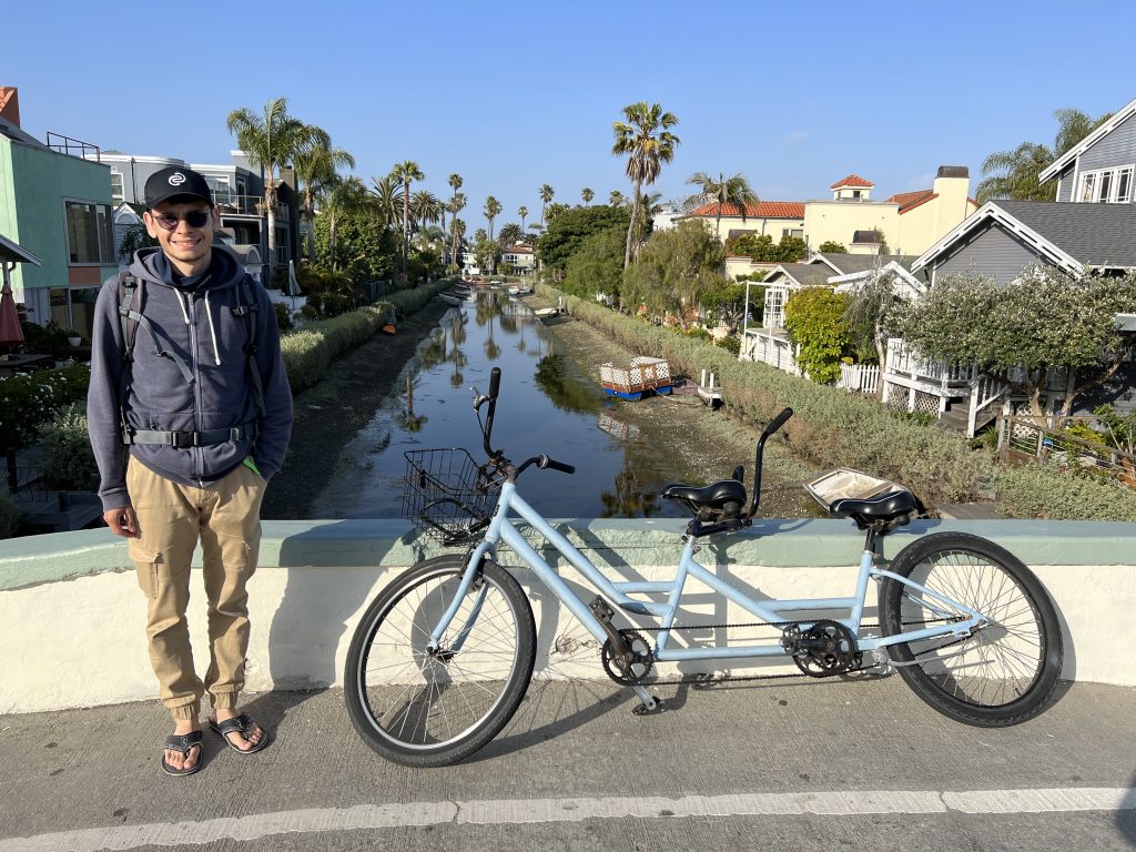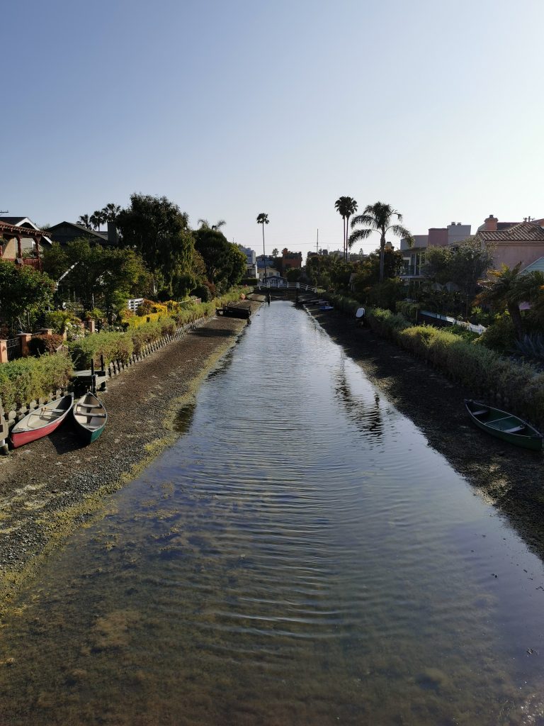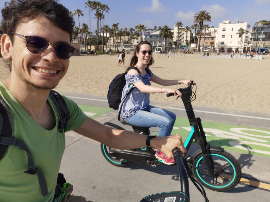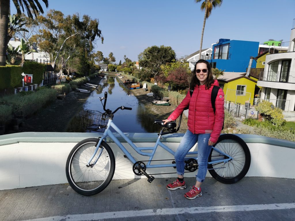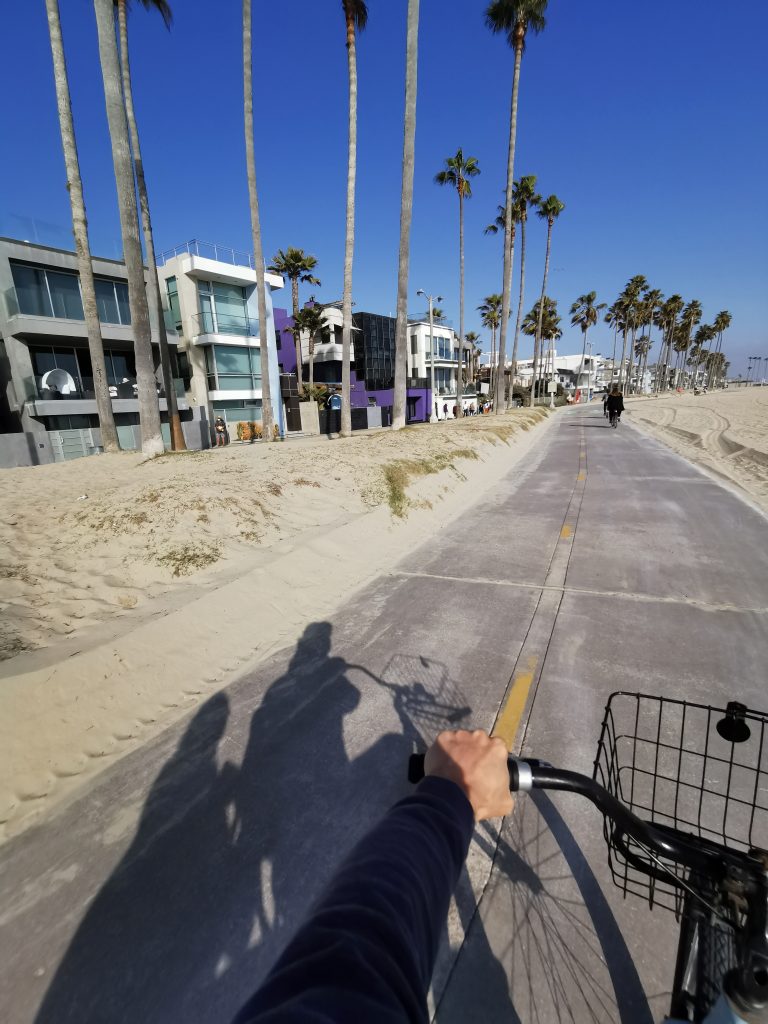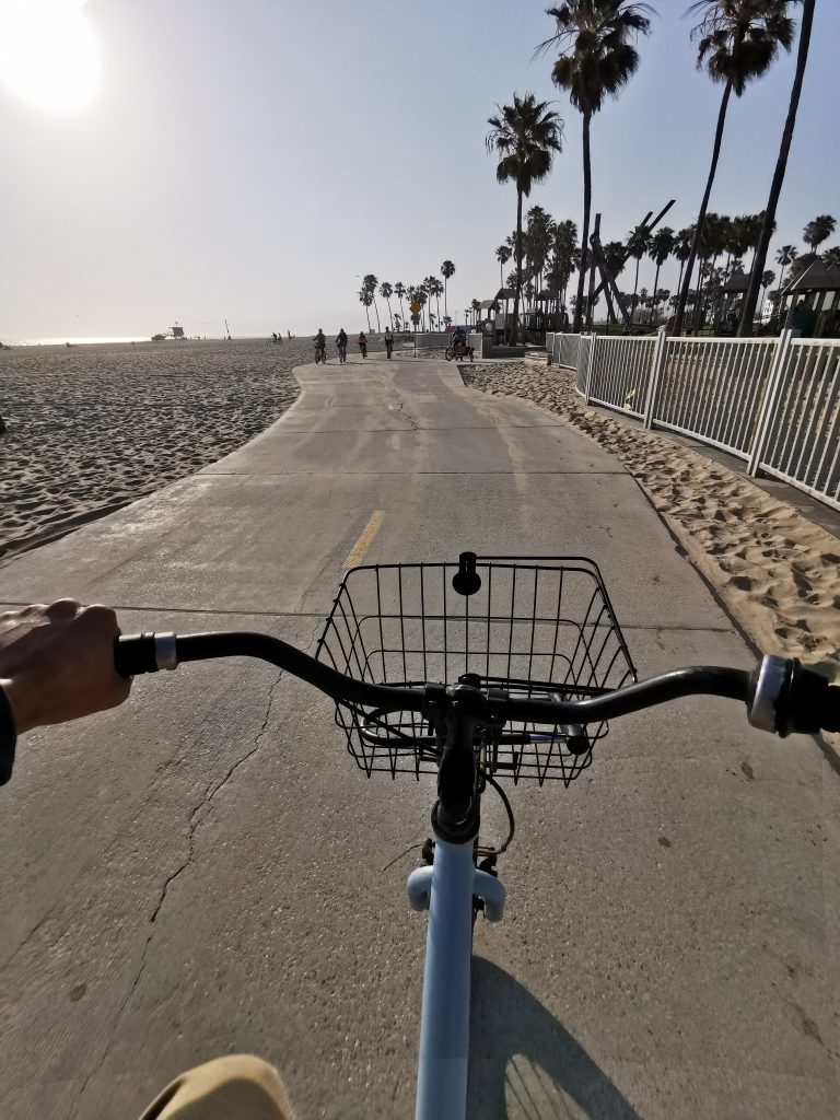 Dort angekommen hat mir Christoph einen elektrischen Roller besorgt, damit ich nicht so weit zum Pier laufen muss. Wir sind dann einmal über den Pier geschlendert und haben unser Mittagessen gegessen, bevor es – diesmal mit zwei Rollern – weiter Richtung Venice Beach ging. Meine Vorstellung war, dass man mit den Rollern schön durch die Kanäle fahren kann, aber Pustekuchen… die Roller gingen grade bis zur Grenze Santa Monica & Venice Beach, danach war Schluss… Auf einmal konnten wir nicht weiterfahren und wir mussten die Roller ein Stück zurückschieben, bis wir sie abstellen konnten. Wir sind dann ein kleines Stück die Promenade entlanggelaufen, dann ging es meinem Fuß leider immer schlechter und wir haben eine kleine Pause machen müssen. Zufällig war neben uns ein Bike Shop, weshalb wir uns spontan dafür entschieden, ein Fahrrad zu mieten. Per Tandem ging es weiter – vorbei am Skatepark und am Muscle Beach bis hin zu den Kanälchen.