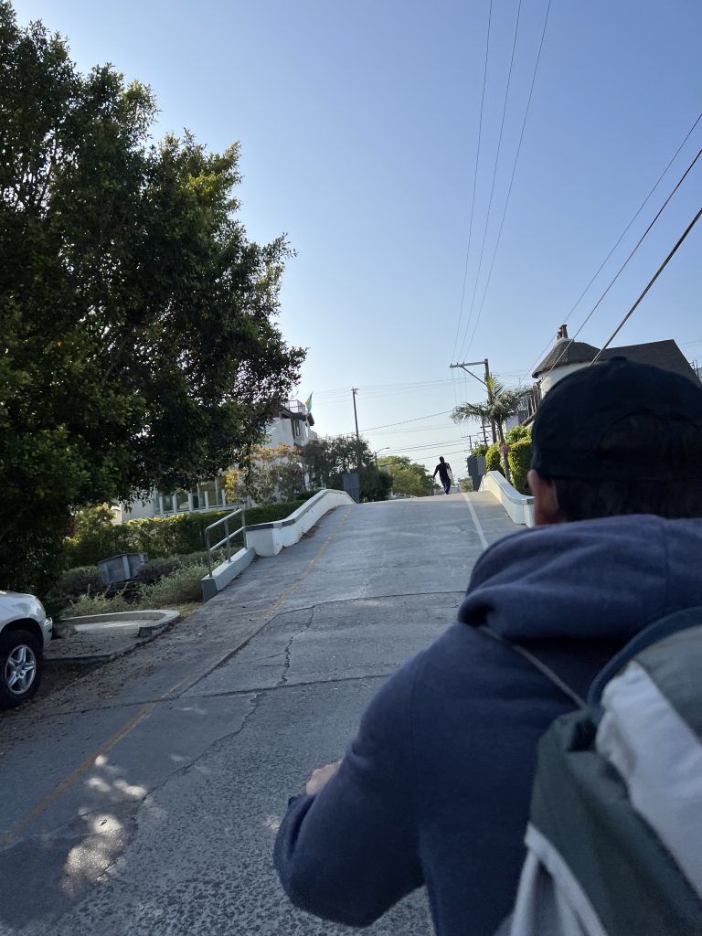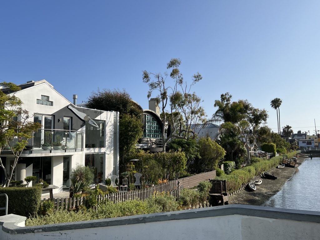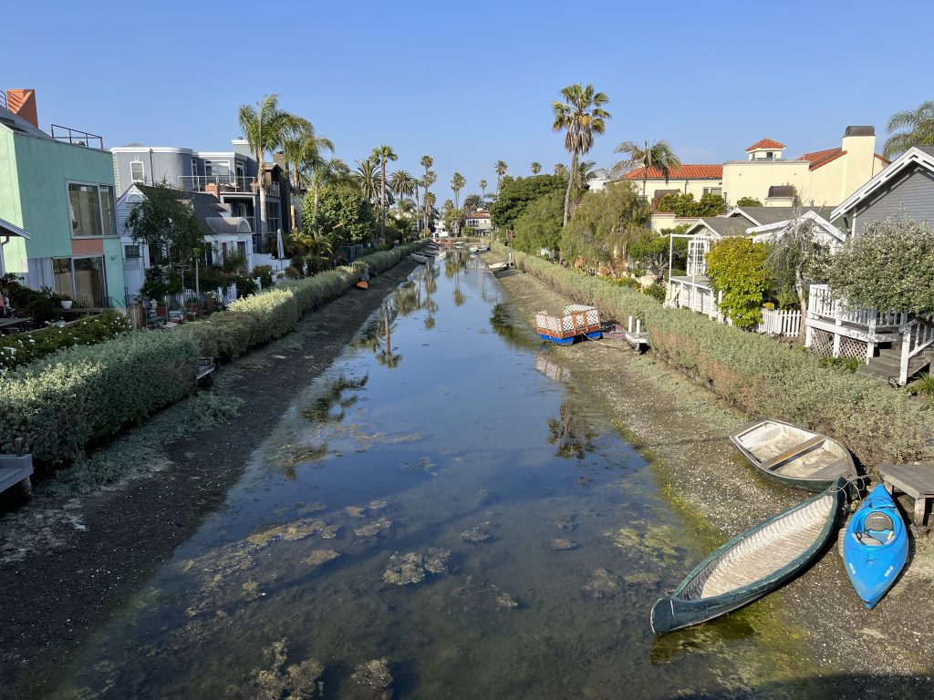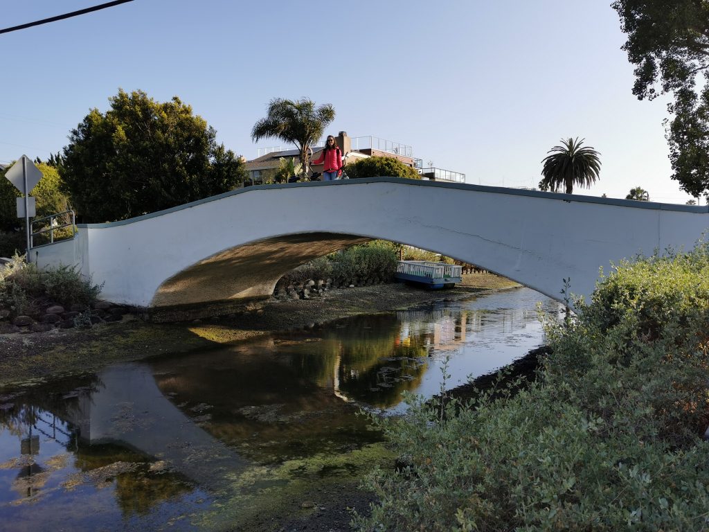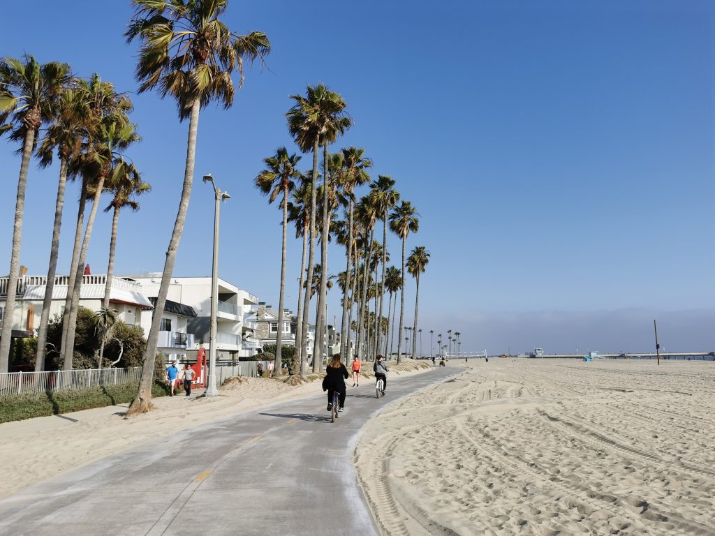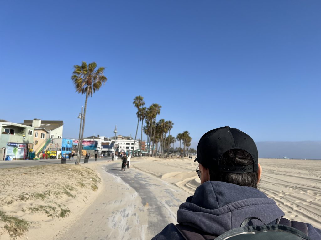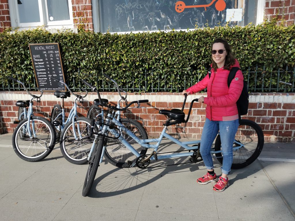Dort angekommen hat mir Christoph einen elektrischen Roller besorgt, damit ich nicht so weit zum Pier laufen muss. Wir sind dann einmal über den Pier geschlendert und haben unser Mittagessen gegessen, bevor es – diesmal mit zwei Rollern – weiter Richtung Venice Beach ging. Meine Vorstellung war, dass man mit den Rollern schön durch die Kanäle fahren kann, aber Pustekuchen… die Roller gingen grade bis zur Grenze Santa Monica & Venice Beach, danach war Schluss… Auf einmal konnten wir nicht weiterfahren und wir mussten die Roller ein Stück zurückschieben, bis wir sie abstellen konnten. Wir sind dann ein kleines Stück die Promenade entlanggelaufen, dann ging es meinem Fuß leider immer schlechter und wir haben eine kleine Pause machen müssen. Zufällig war neben uns ein Bike Shop, weshalb wir uns spontan dafür entschieden, ein Fahrrad zu mieten. Per Tandem ging es weiter – vorbei am Skatepark und am Muscle Beach bis hin zu den Kanälchen.